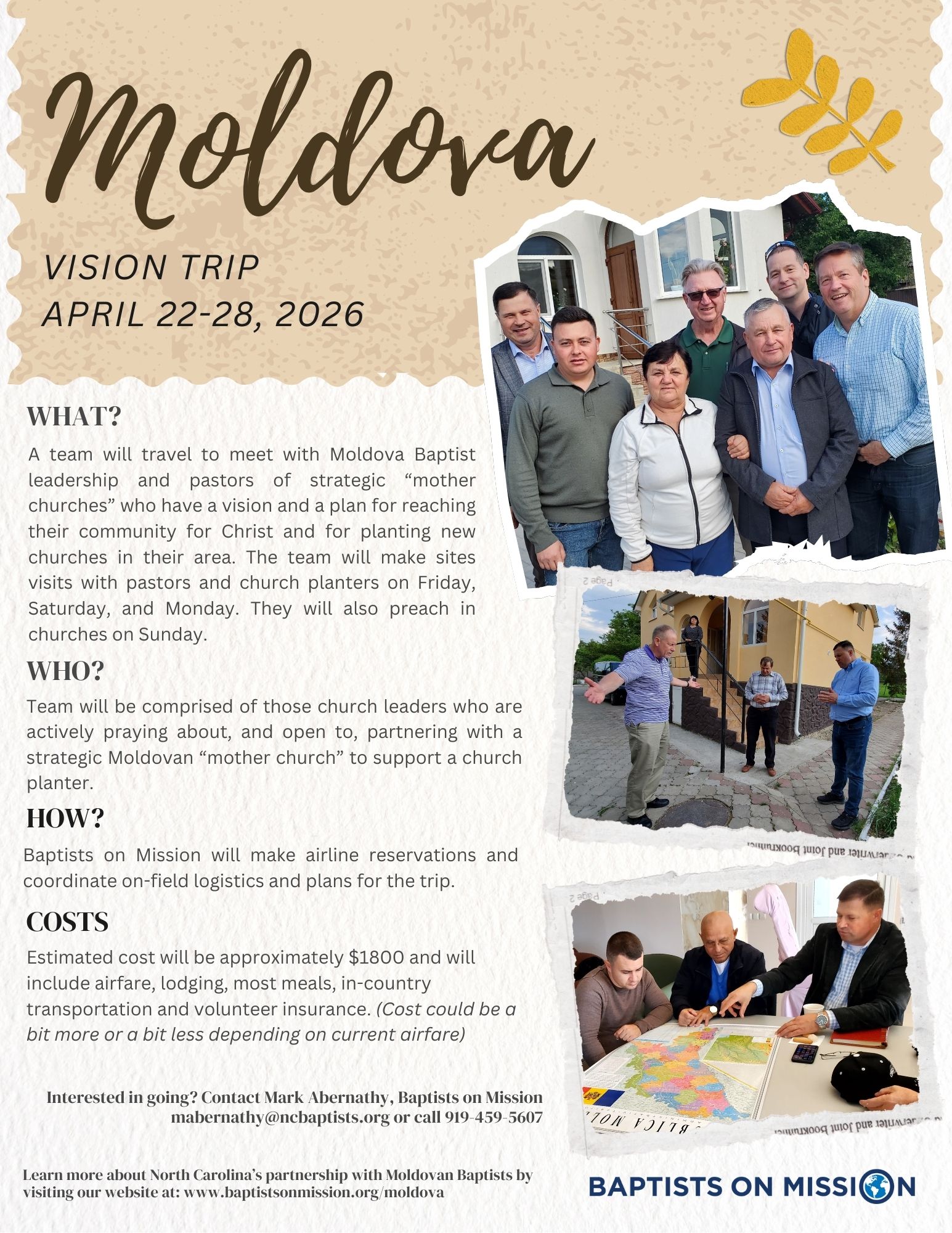 MOLDOVA VISION TRIP - April 22-28, 2026 A team will travel to Moldova to meet with Moldova Baptist leadership and pastors of strategic "mother churches" who have a vision and plan for reaching their community for Christ and plant a new church(es) in their area. The team will make site visits with pastors and church planters on Friday, Saturday, and Monday. They will also preach in churches on Sunday. Click for a flyer with more information, and contact Mark Abernathy (mabernathy@ncbaptist.org or 919-291-36570) if you are a pastor or church staff member interested in participating in this trip on behalf of your church.